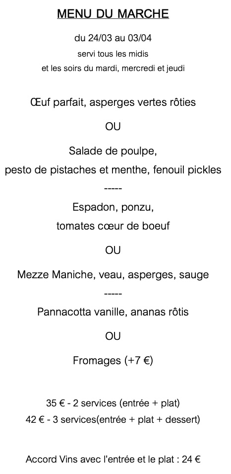 Un menu du marché/lunch renouvelé chaque semaine et servi midi et soir du mardi midi au vendredi midi